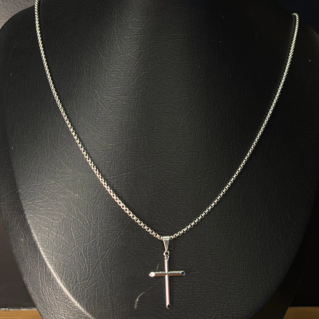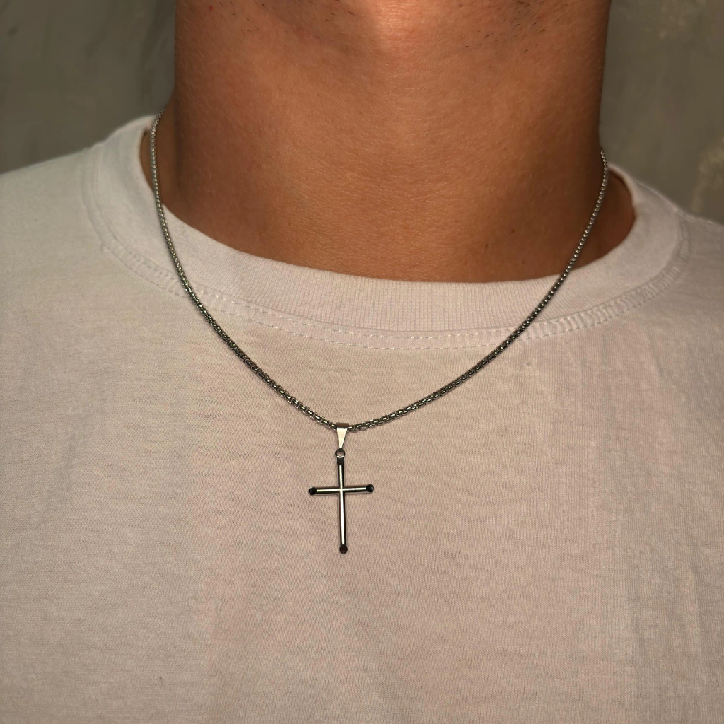 O Cordão Mileto é a escolha ideal para quem valoriza significado e minimalismo em um só acessório. Com uma corrente prateada de elos finos e pingente de cruz lisa, seu design é clean e impactante, perfeito para destacar o visual sem exageros.