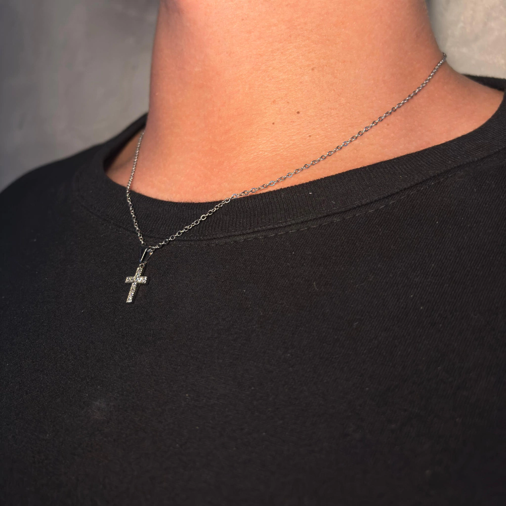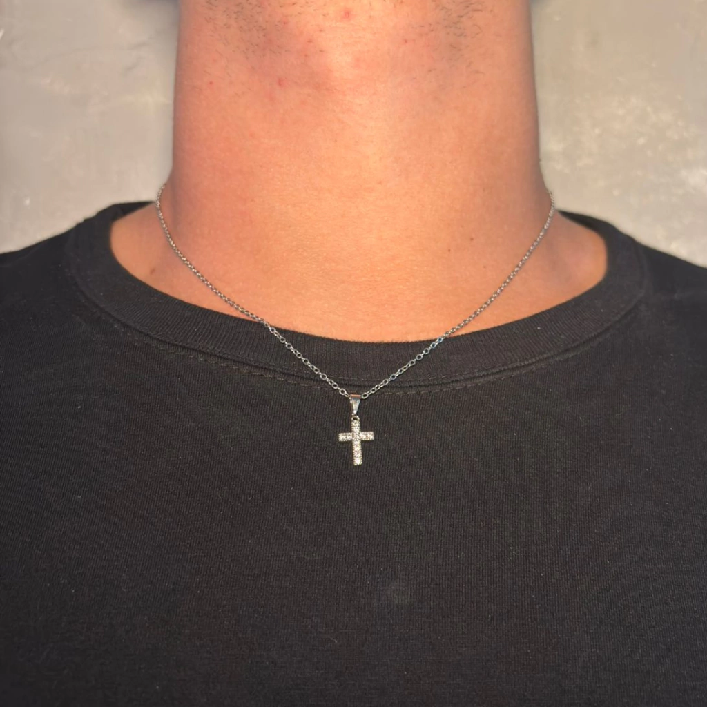 O Cordão NJ é a escolha perfeita para quem quer unir o significado do símbolo da cruz com o brilho sutil das pedras cravejadas. Seu design combina uma corrente delicada prateada com um pingente de cruz minuciosamente cravejado, criando um acessório elegante, moderno e com presença marcante.