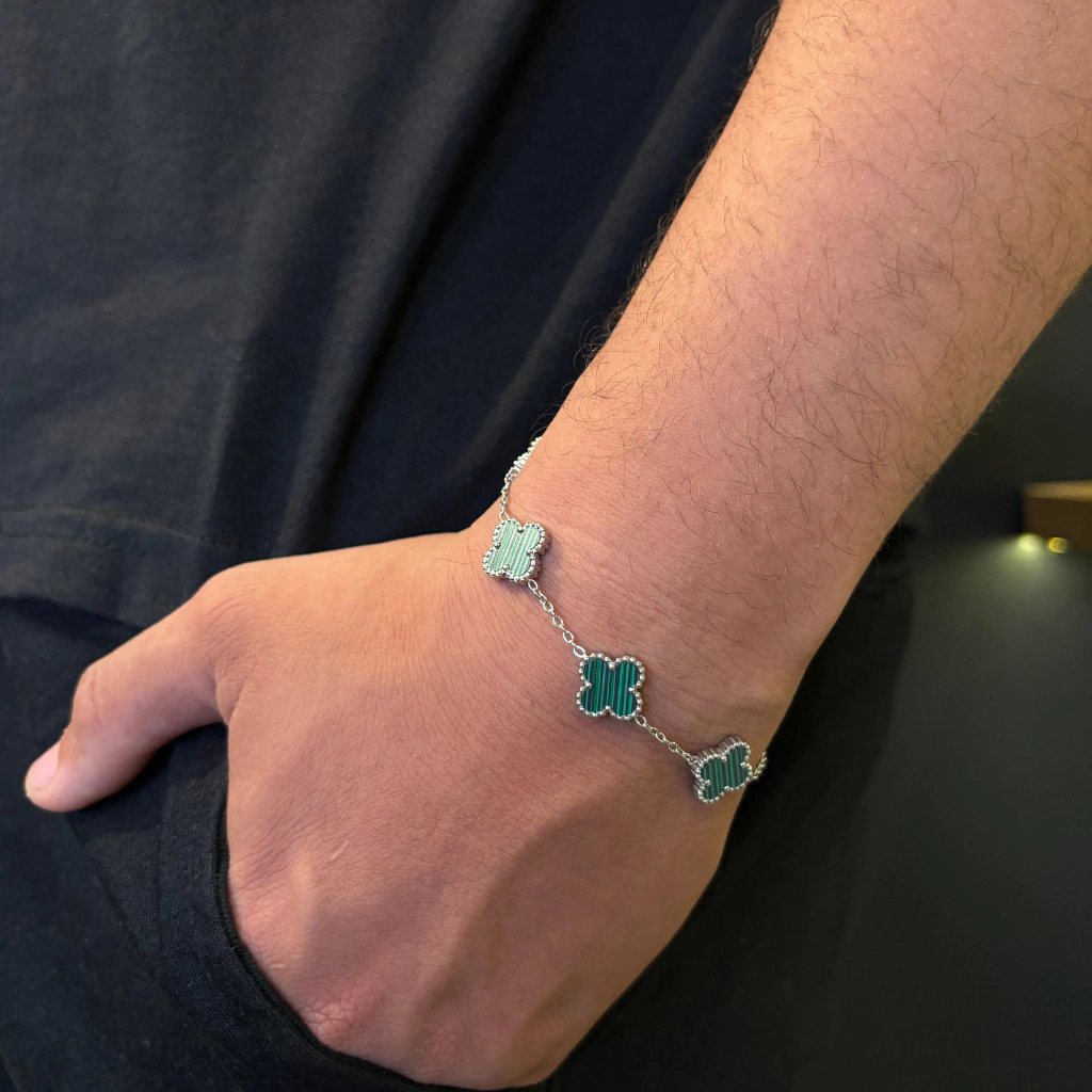Apresentamos a Pulseira Trevo, uma peça sofisticada e versátil para quem busca elegância e significado no dia a dia. Produzida em aço inoxidável e composta internamente por pedra malaquita, essa pulseira é sinônimo de estilo e proteção.